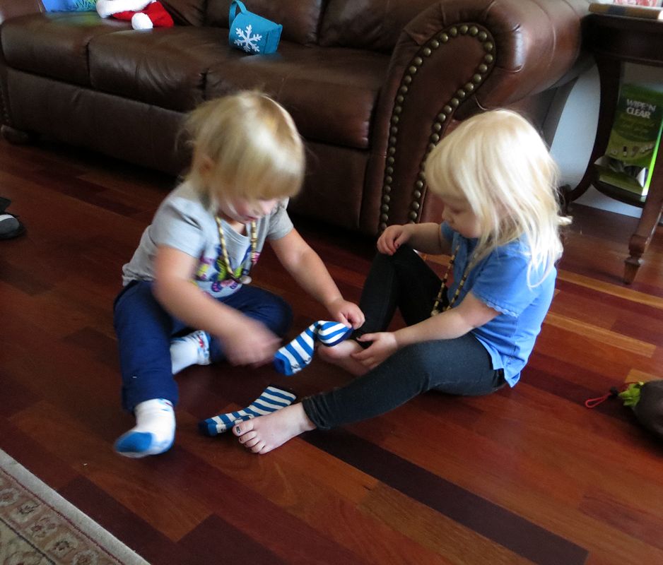 Надевает носки сестре