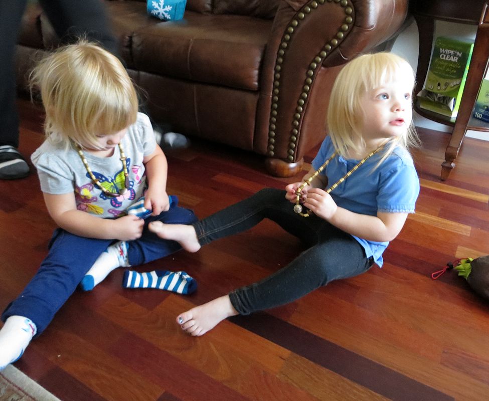 Надевает носки сестре