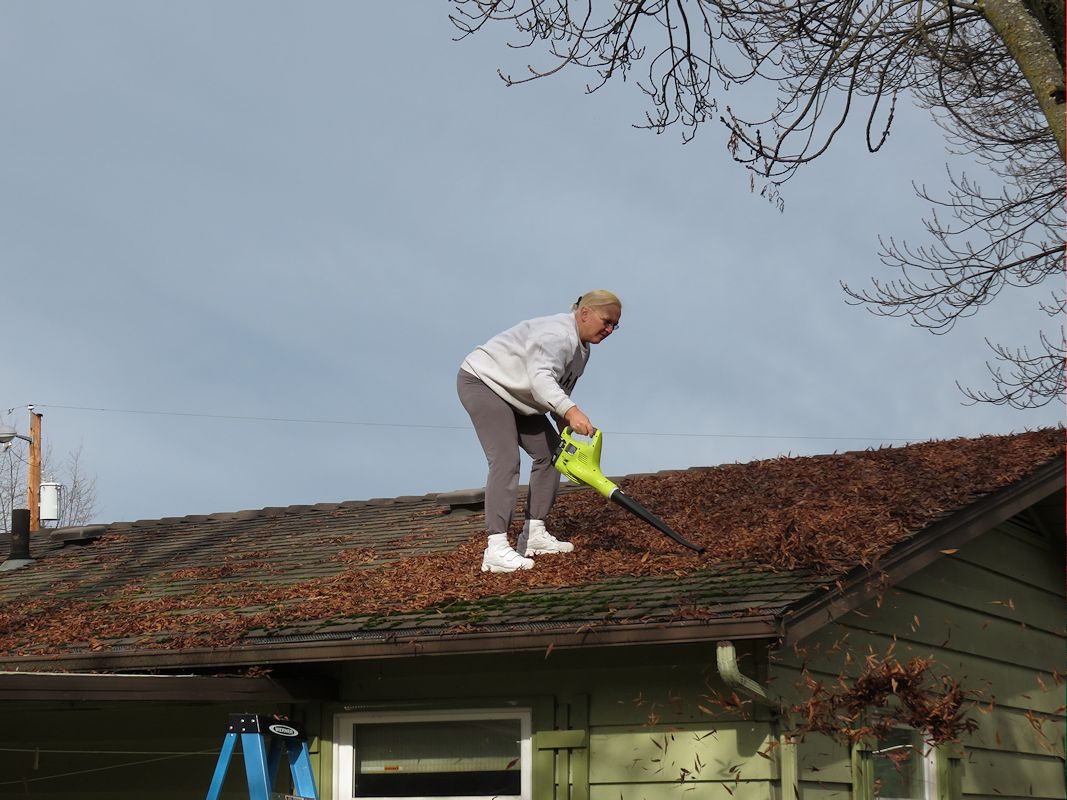 Сдувает листву с крыши