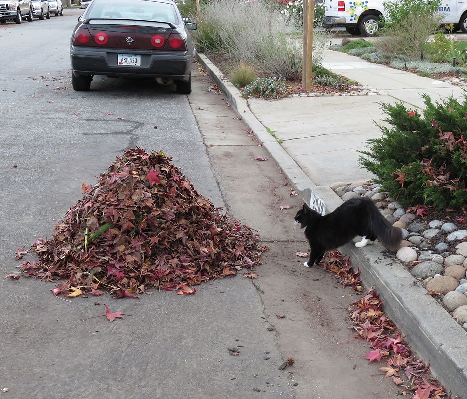 Изучает кучу листьев