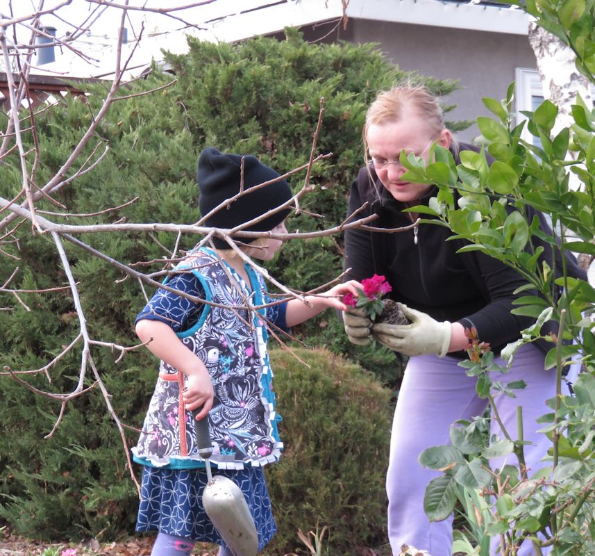 Сажает цветы